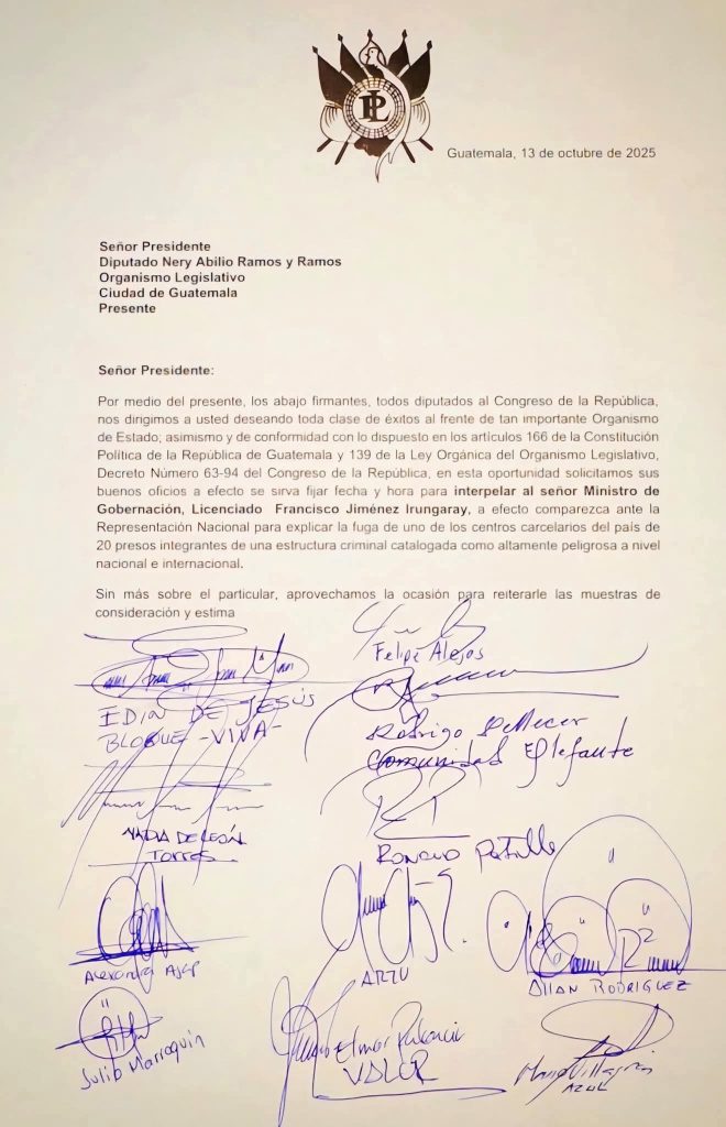 Diputados de diversas bancadas presentaron una solicitud para interpelar al ministro de Gobernación, Francisco Jiménez, después de la fuga de 20 reos del Centro de Detención para Hombres, Fraijanes II y donde las explicaciones del titular de la cartera de seguridad no convencen a la mayoría de los guatemaltecos.