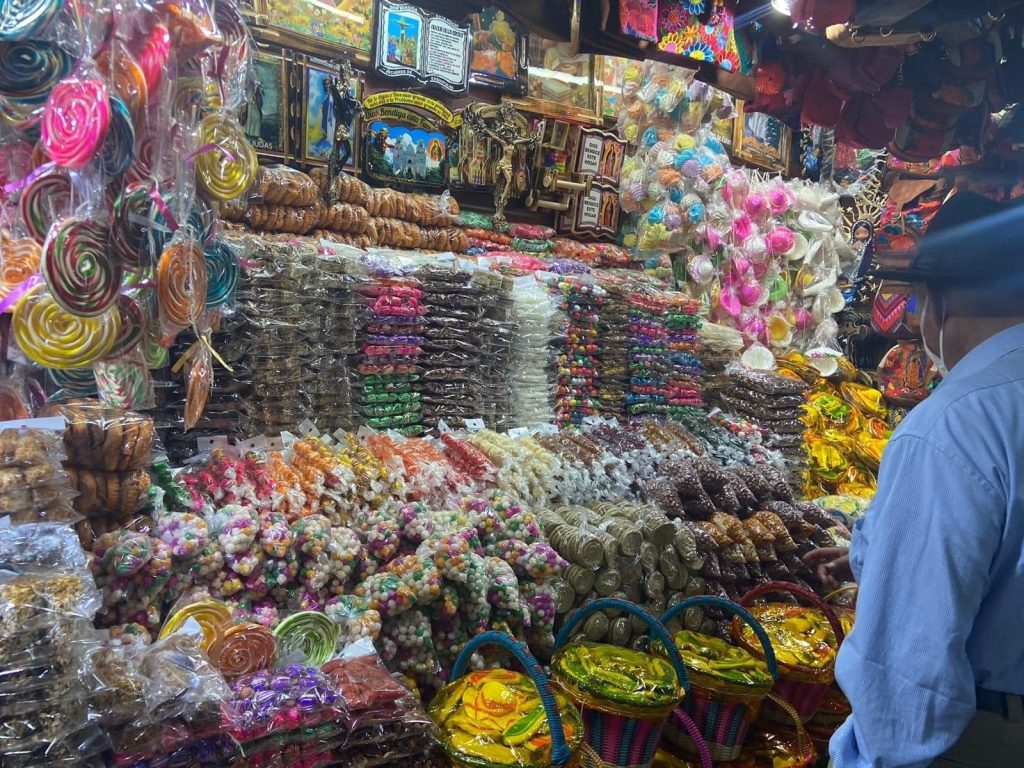 Dulces y platillos típicos, pulseras, carteras, cuadros, mantas y otros artículos elaborados por artesanos locales, así como imágenes religiosas, están en exhibición y disponibles para los turistas.