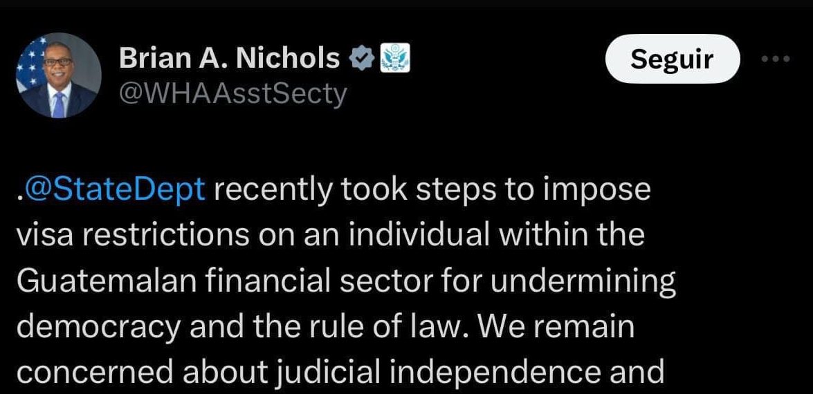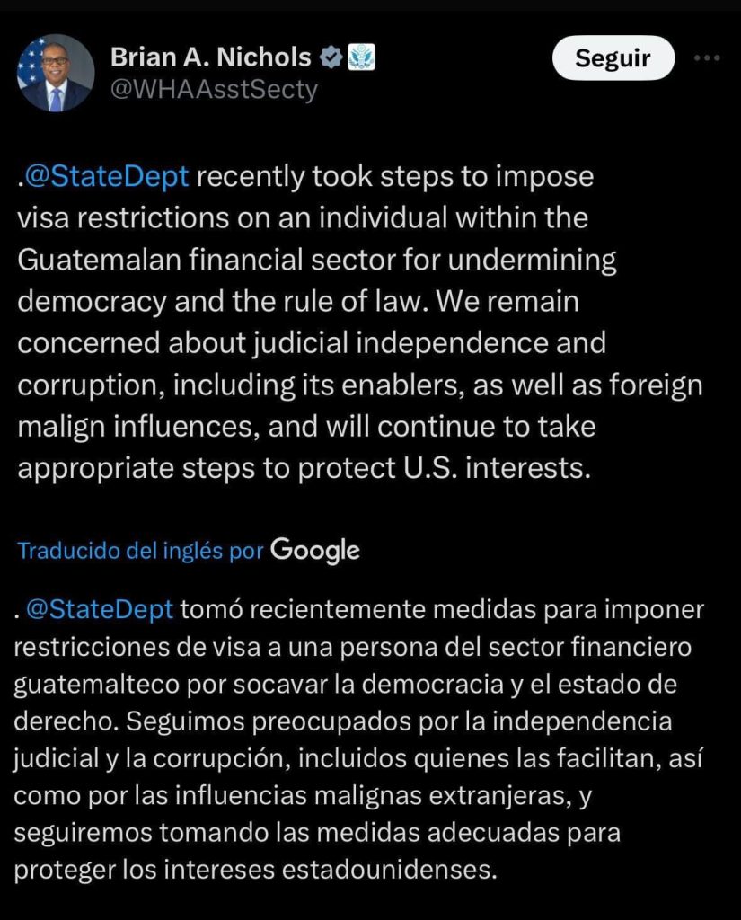 En su red social X Nichols anunció que el Departamento de Estado “tomó recientemente medidas para imponer restricciones de visa a una persona del sector financiero guatemalteco por socavar la democracia y el estado de derecho”.