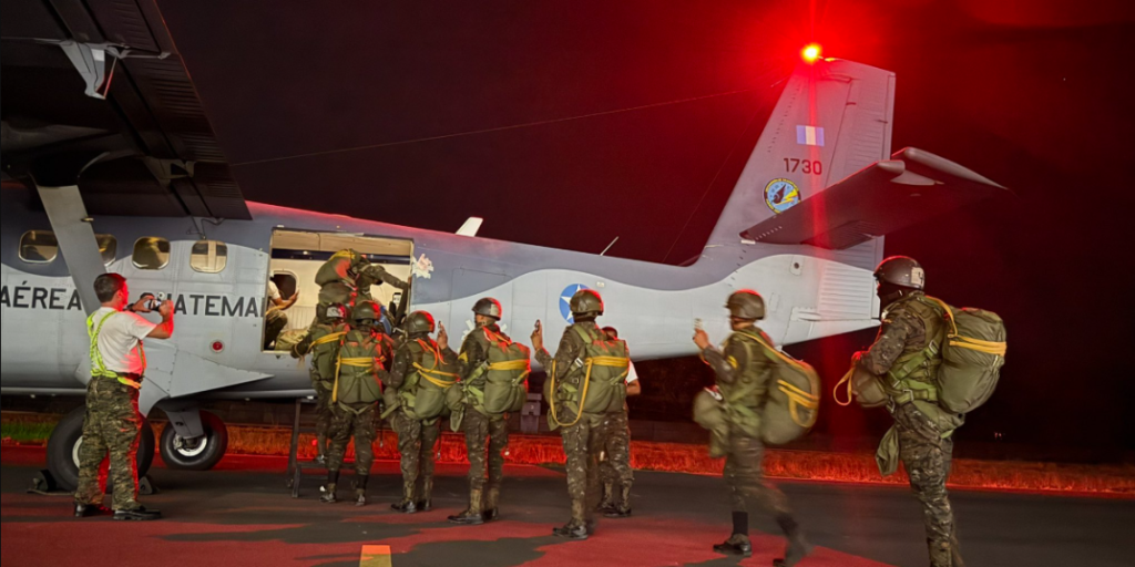 El Ejército de Guatemala reforzó las acciones de seguridad fronteriza entre Guatemala y México mediante un salto aerotransportado nocturno realizado por la Brigada de Paracaidistas, como parte de las operaciones que se desarrollan en la línea divisoria entre ambos países.