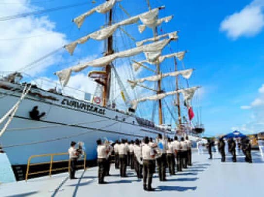 El buque escuela Velero ARM “Cuauhtémoc” de la Armada de México llegó a Puerto Quetzal, Escuintla. En el acto de bienvenida organizado por el Ejército por medio de la Escuela Naval de Guatemala. La llegada de esta embarcación causa una gran emoción entre los residentes locales y las autoridades navales.