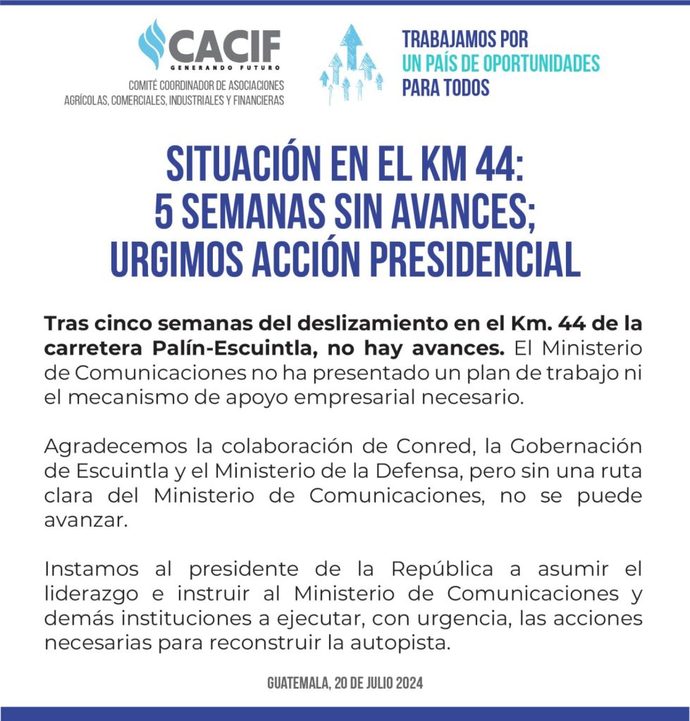 Hoy se dio a conocer en las redes sociales de esta entidad que no ven avances en 5 semanas en el deslizamiento en el kilómetro 44 de la referida autopista, donde el Cuerpo de Ingenieros del Ejército está realizando trabajos a pesar que la responsabilidad todavía es todavía de la empresa Marhnos a quienes desde el año anterior se les concedió la pista Escuintla-Puerto Quetzal, la cual fue aprobada a marcha forzada por el anterior gobierno y el anterior Congreso de la República.