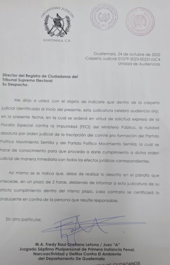 En un documento enviado al Registro de Ciudadanos un documento en el que declara nulidad absoluta al partido Semilla y otorga dos horas a este ente del Tribunal Supremos Electoral para que cumplan con lo que dice la ley de declarar vacantes los puestos de elección que ganó Semilla en el 2026.