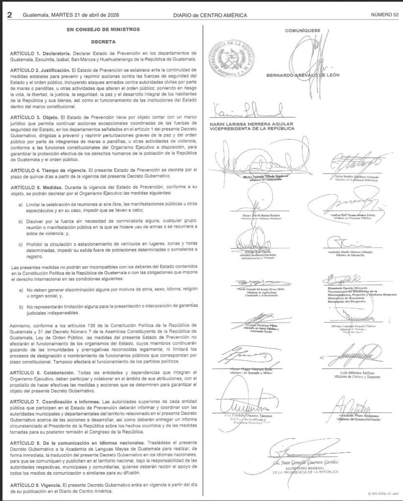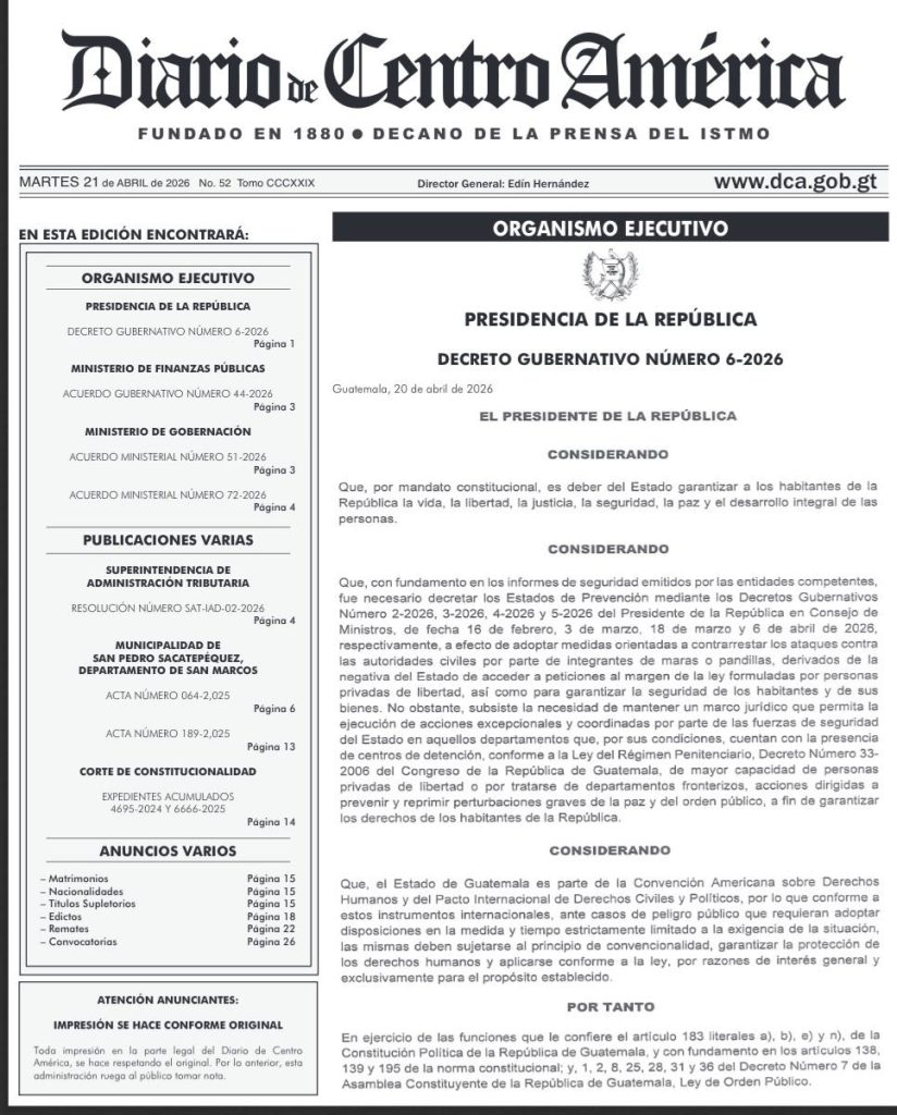 El nuevo estado de excepción tendrá una vigencia de 15 días, entra en vigor este martes luego de que se publicó en el Diario de Centro América el Decreto Gubernativo 6-2026.