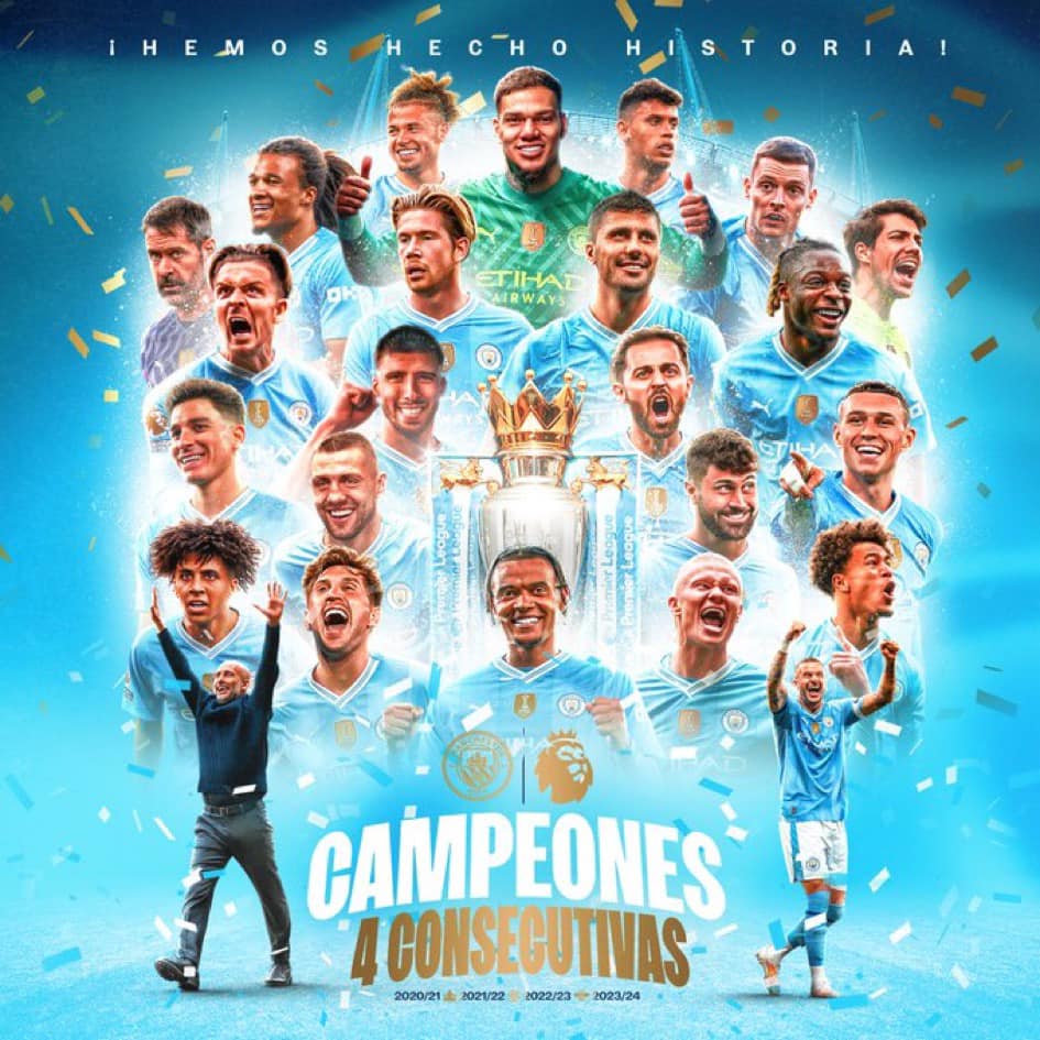 En una nueva muestra de poderío en el torneo doméstico, el Manchester City conquistó su cuarta Premier League de forma consecutiva, siendo el único equipo en lograr hilar 4 ligas en la era moderna del futbol inglés (2021, 2022, 2023, 2024).