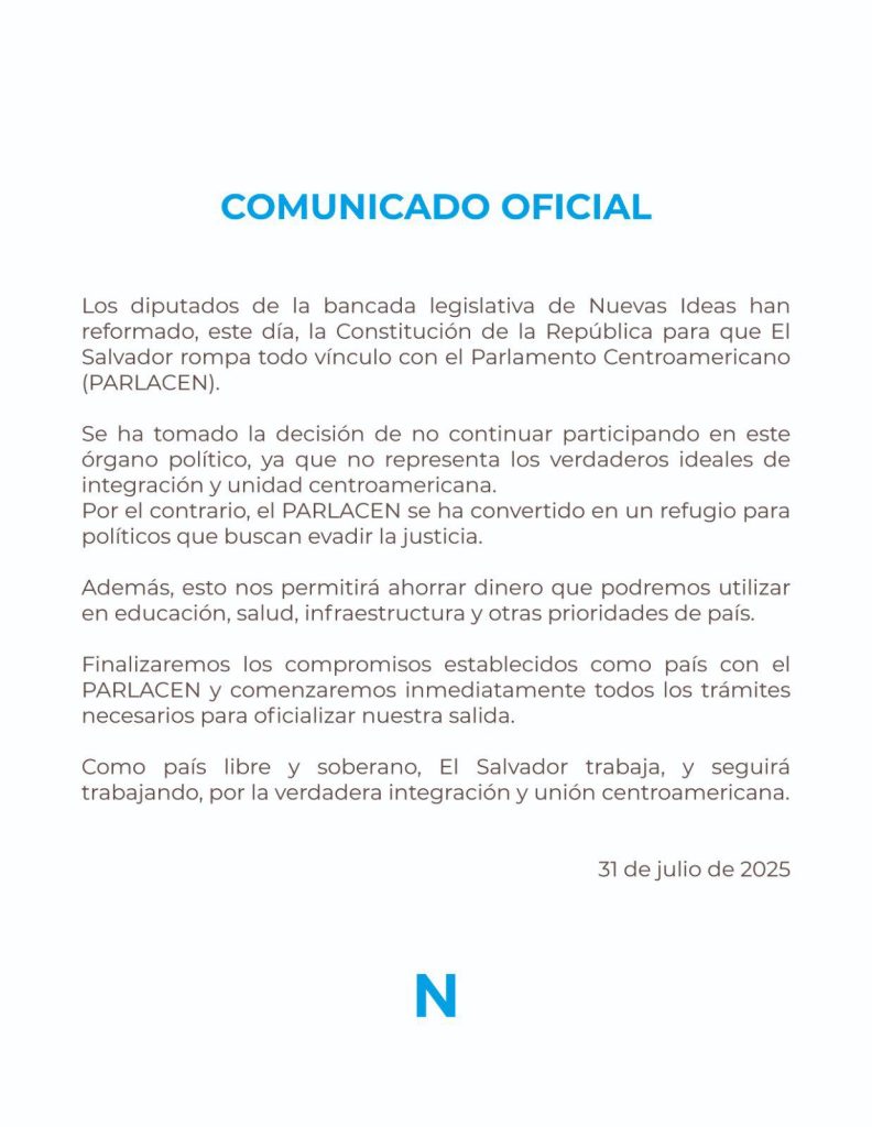 En un comunicado expresaron que los diputados de la bancada legislativa de Nuevas Ideas han reformad, la Constitución Política para que el Salvador rompa todo vínculo con el Parlacen, pues no representa los verdaderos ideales de integración y unidad centroamericana y por el contrario “se ha convertido en un refugio para políticos que buscan evadir la justicia”.