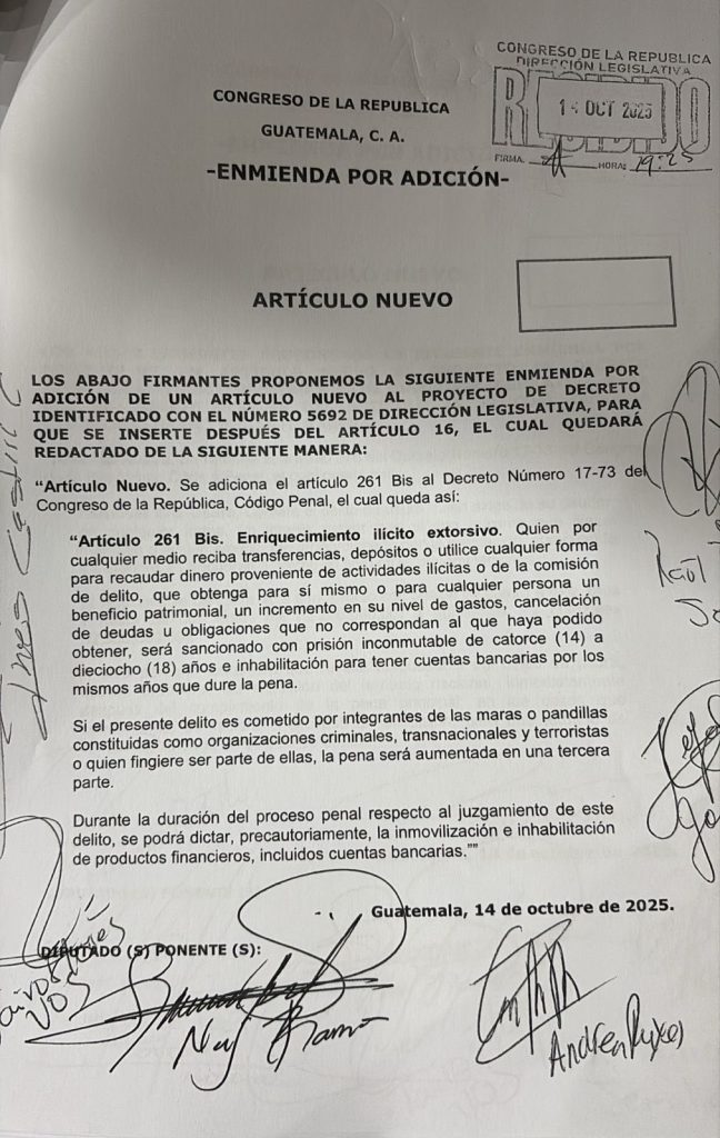 La inclusión de un nuevo artículo para penalizar el enriquecimiento ilícito extorsivo logra el apoyo de 140 diputados esta noche en el Congreso de la República durante la aprobación de la Ley Antimaras