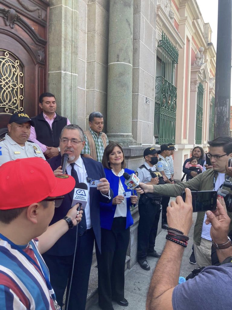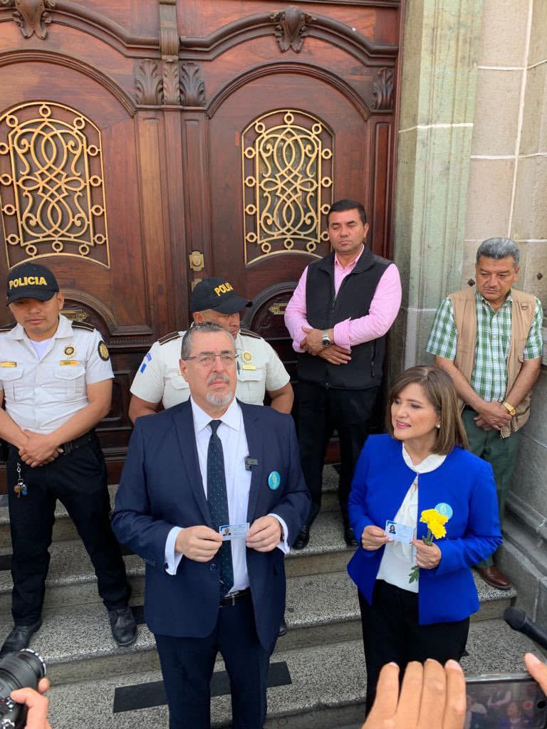 El Registro de Ciudadanos del Tribunal Supremo Electoral TSEG entrega este sábado las credenciales al binomio presidencial del partido Movimiento Semilla encabezado por Bernardo Arévalo de León y Karin Herrera con el que se oficializa su inscripción y están listo para participar en las elecciones