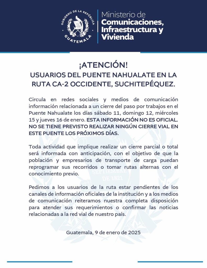 “Circula en redes sociales y medios de comunicación información relacionada a un cierre del paso por trabajos en el Puente Nahualate los días sábado 11, domingo 12, miércoles 15 y jueves 16 de enero. Está información no es oficial” expresa el CIV en un conunixadi de prensa divulgado la