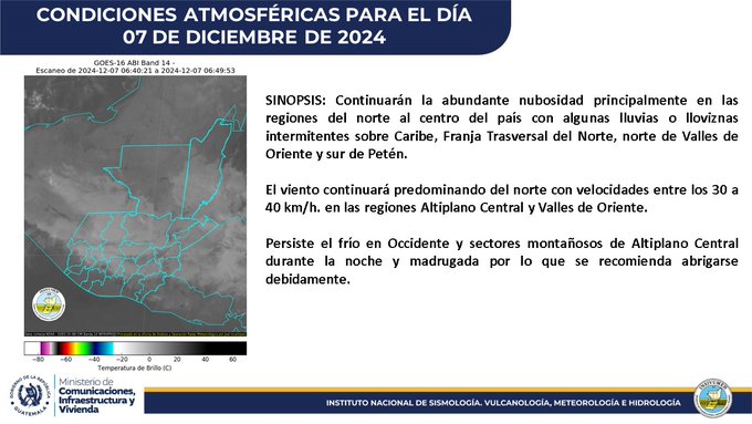La institución ha compartido las condiciones clima climáticas para este 7 de diciembre, destacando que en varios puntos del país se mantendrán las bajas temperaturas. De acuerdo con el Insivumeh, departamentos como Chimaltenango, Huehuetenango, Quetzaltenango y Sacatepéquez presentarán podrían ser los más fríos, llegando a temperaturas mínimas de entre 2 y 8 grados centígrados.