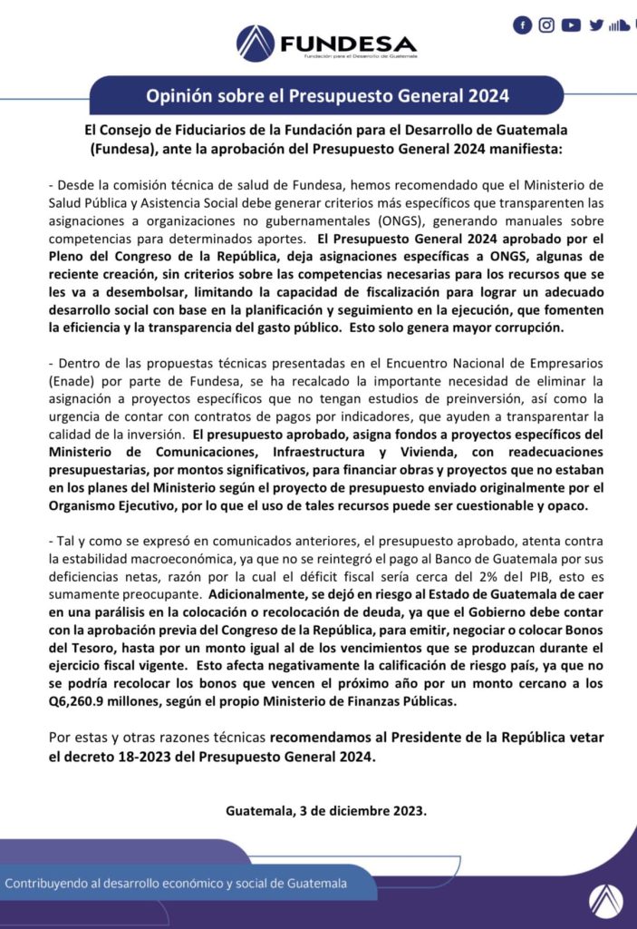 La Fundación para el Desarrollo de Guatemala FUNDESA a pedido públicamente este domingo al Presidente de la República Alejandro Giammattei que vete el Presupuesto general 2024 por atentar contra la estabilidad macroeconómica del País y que el mismo genera corrupción