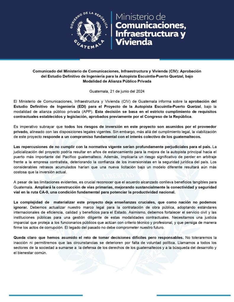 Agrega que la judicialización del proyecto podría resultar en años de estancamiento para la mejora de la autopista principal hacia el puerto más importante del Pacífico guatemalteco. Además, implicaría un riesgo significativo de perder en arbitraje frente a la empresa contratista, deteriorando la confianza de los inversionistas en la seguridad jurídica del país.