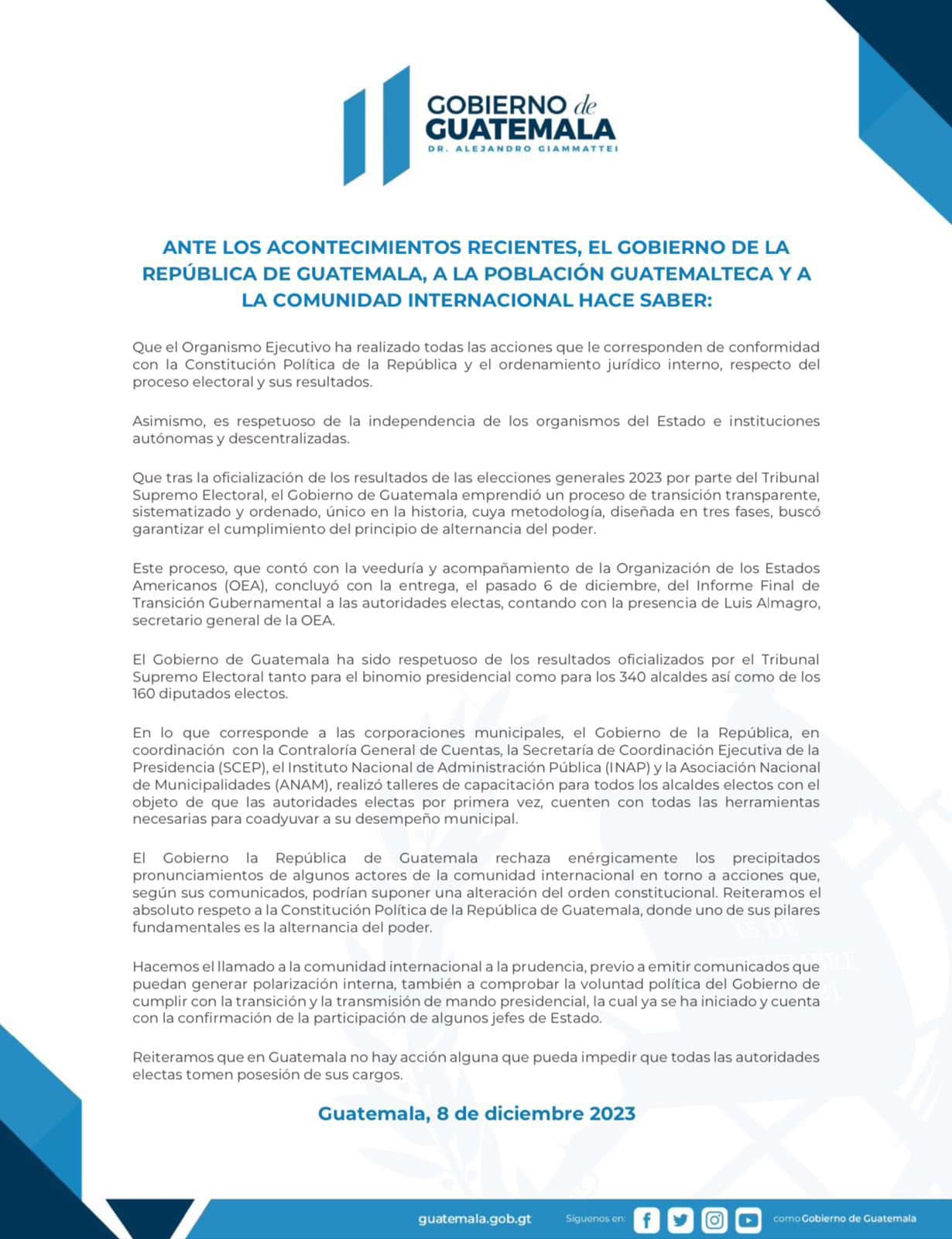 El Gobierno la República de Guatemala rechaza enérgicamente los precipitados pronunciamientos de algunos actores de la comunidad internacional en torno a acciones que, según sus comunicados, podrían suponer una alteración del orden constitucional.