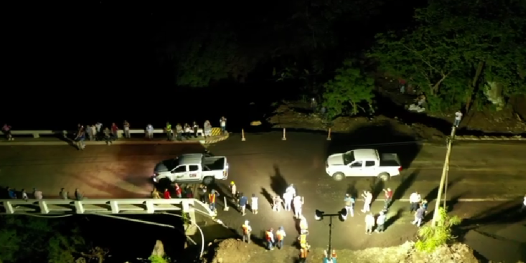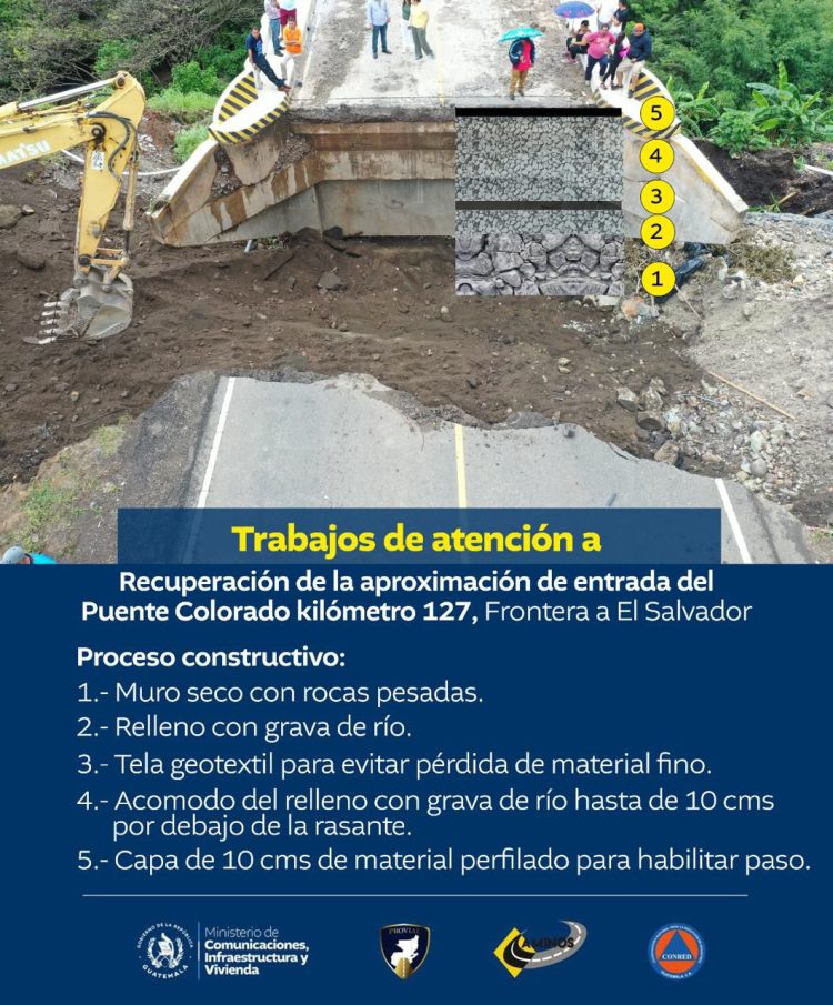 El puente El Colorado está ubicado en el kilómetro 128 de la CA-1, a 28 kilómetros de la frontera con El Salvador y la carretera, justo antes de ese tramo, colapsó debido a un socavamiento provocado por las intensas lluvias.