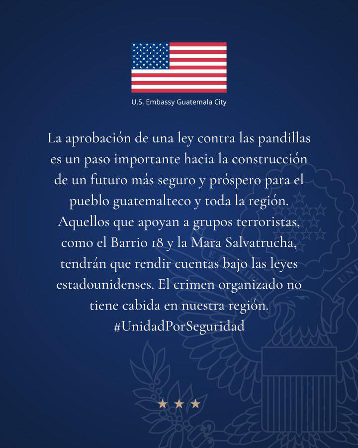 “La aprobación de una ley contra las pandillas es un paso importante hacia la construcción de un futuro más seguro y próspero para el pueblo guatemalteco y toda la región” expresa el gobierno de los Estados Unidos