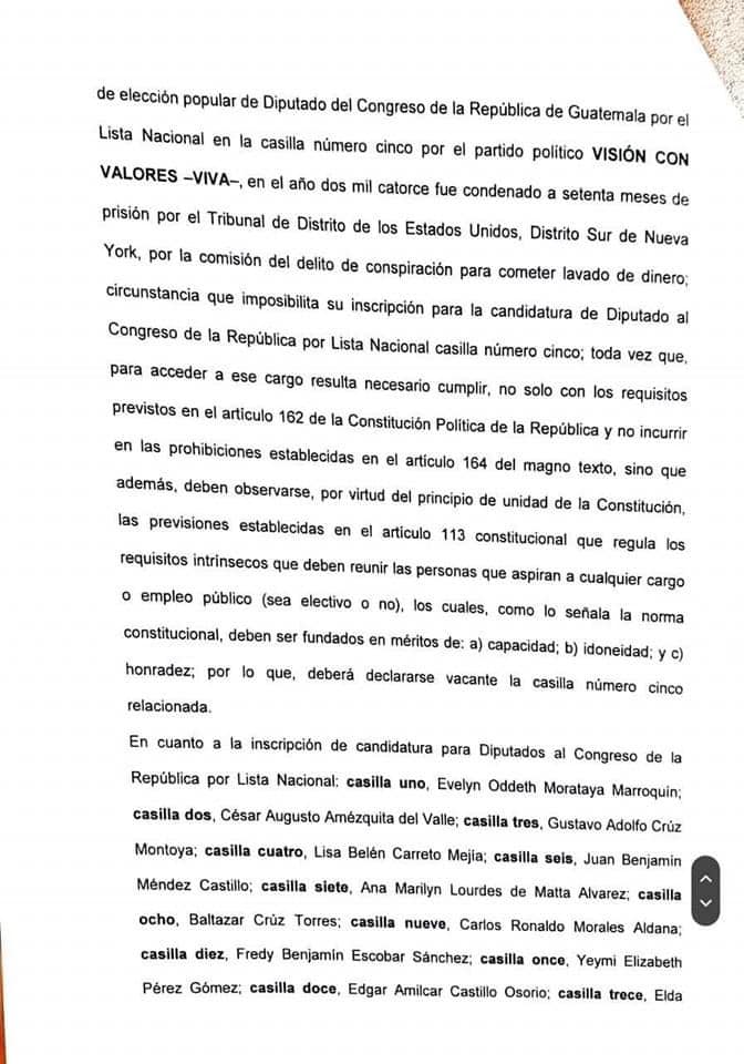 El registró de Ciudadanos del Ttibunal Supremo Electoral TSE denegó la inscripción como candidato a diputado del expresidente Alfonso Portillo, quien ocupaba la quinta casilla del listado nacional por el partido Vision con Valores Viva.