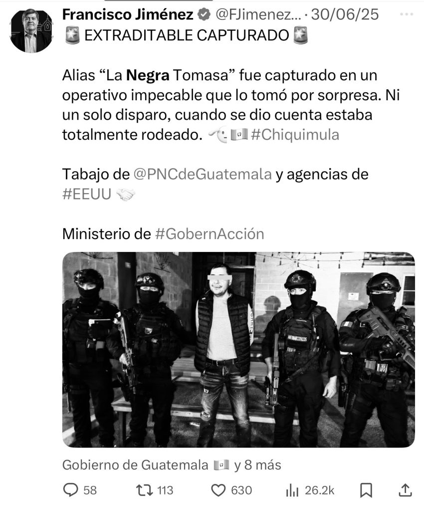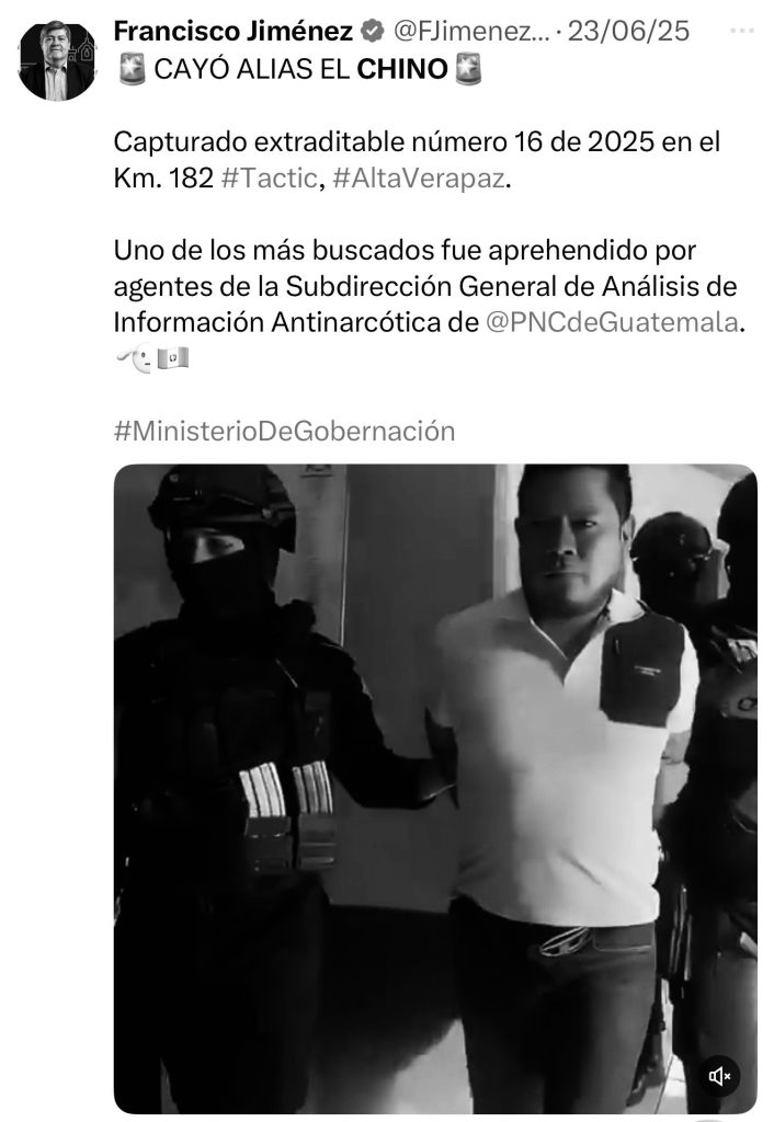 El ministro de Gobernación, Francisco Jiménez, informó por medio de su cuenta en la red social X sobre la extradición de dos personas capturadas este año en Guatemala, ambas requeridas por la justicia de Estados Unidos por delitos relacionados con el narcotráfico.