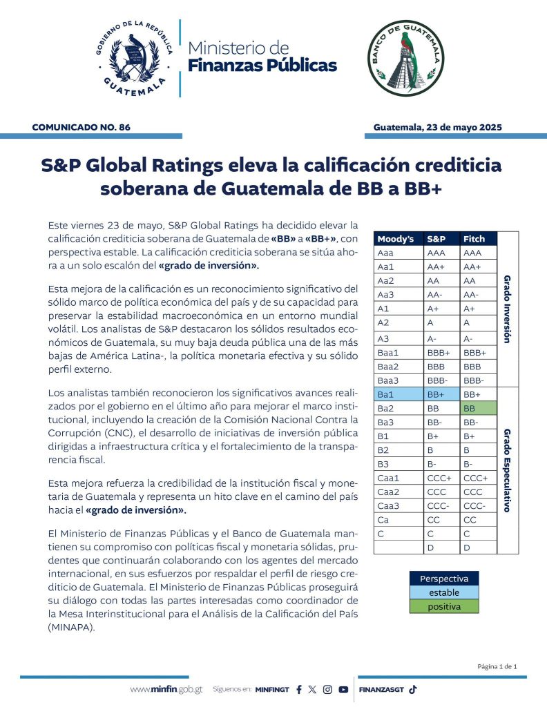Con BB+ en S&P, Guatemala se posiciona en la cima de calificaciones de grado especulativo, justo debajo de la línea umbral que debe pasar para ingresar al grupo de grado de inversión, una de las metas de las autoridades del Minfin para mejorar el clima de inversión en nuestro país.