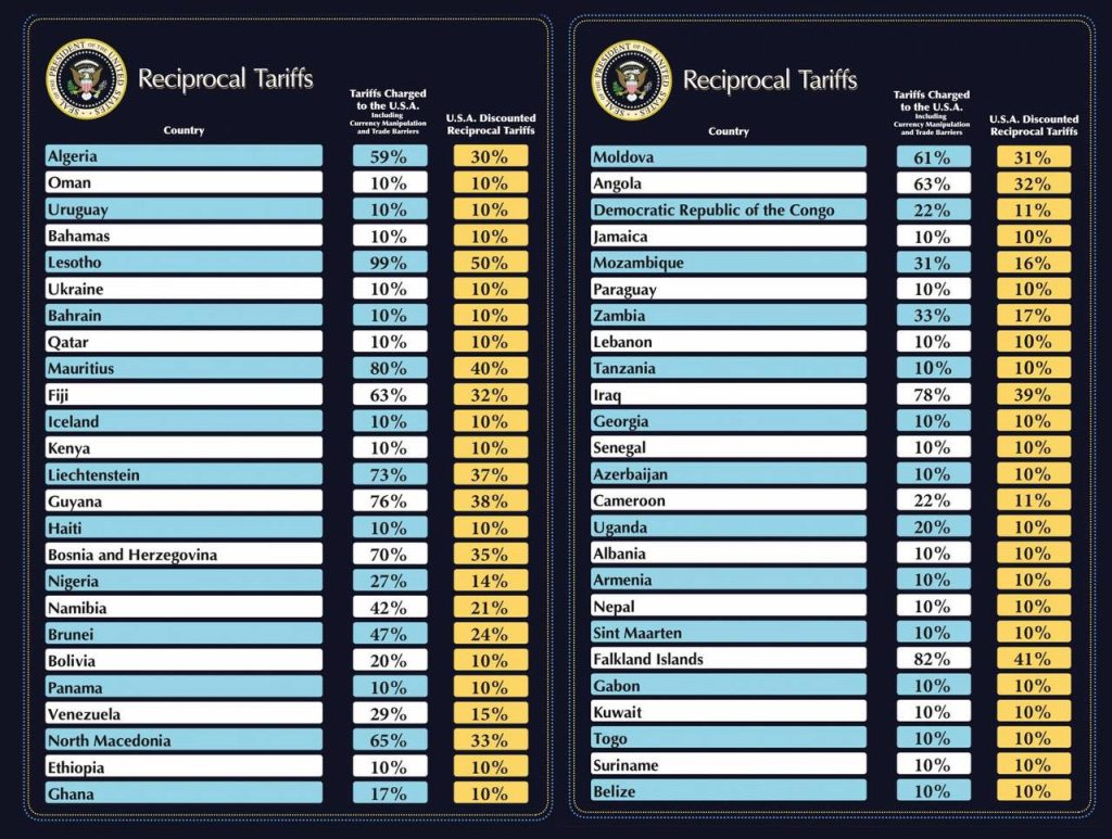 Entre los países afectados se encuentran China, con un arancel del 34%, la Unión Europea, con un 20%, y Vietnam, con una de las tasas más altas, un 46%.