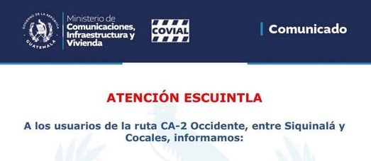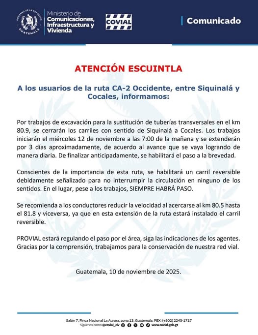 Se informa a la población que a partir del miércoles 12 de noviembre, desde las 7:00 AM, se cerrará un carril en la ruta de Siquinalá hacia Santa Lucía Cotzumalguapa, específicamente en el tramo de la Circunvalación, debido a trabajos de mantenimiento y mejora vial.