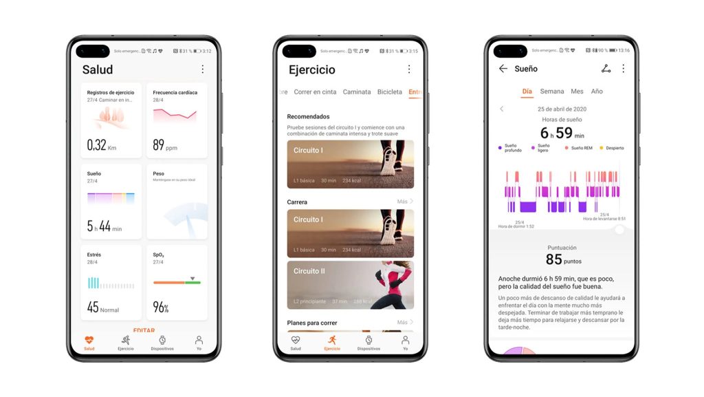 La app Salud de Huawei ofrece planes de ejercicio personalizados para cada nivel, con rutinas específicas para cada grupo muscular y sesiones variadas como HIIT, Tai Chi, yoga, meditación y hasta entrenamientos para mejorar tu juego de golf. Para actividades al aire libre como correr o andar en bici, muestra mapas en pantalla, integra GPS y analiza altitud, ajustando la intensidad según tu rendimiento. Sus planes de carrera se adaptan a tu evolución, guiando cada paso con precisión