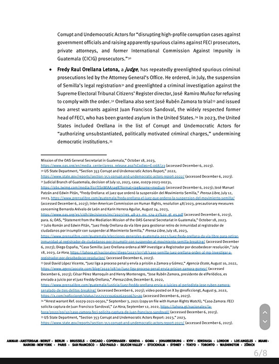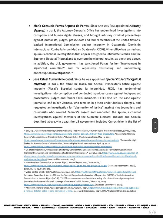 Además, en el documento se lee: “en los últimos años, las autoridades guatemaltecas han socavado las salvaguardias de derechos humanos y los controles institucionales sobre el abuso de poder para evitar la rendición de cuentas por la corrupción generalizada de alto nivel. Más recientemente, han atacado el derecho al voto durante las elecciones de 2023 que ganó el candidato anticorrupción Bernardo Arévalo”.