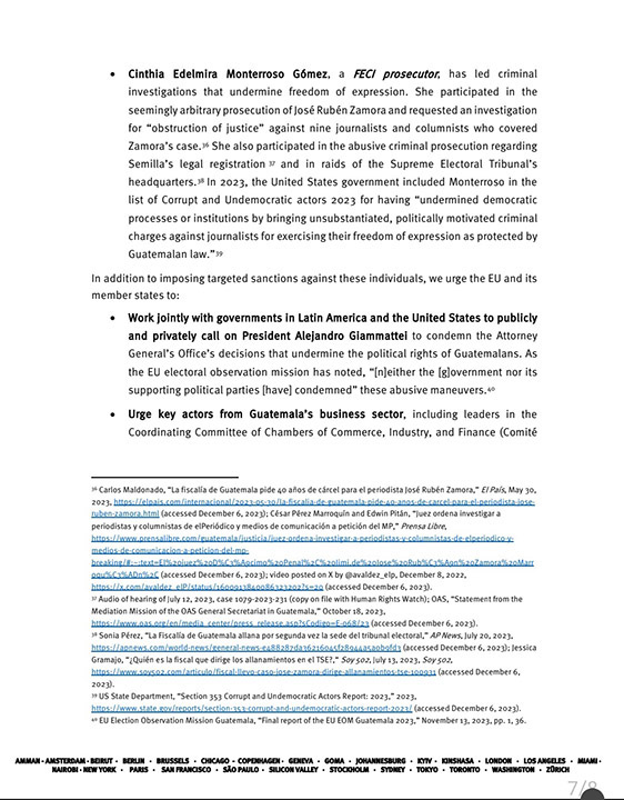 Según carta enviada al referido organismo, se detalló: «instamos a la UE y a sus Estados miembros a imponer sanciones específicas, incluida la congelación de activos y la prohibición de viajar, contra altos funcionarios gubernamentales responsables de graves violaciones de derechos humanos, incluidas, entre otras.