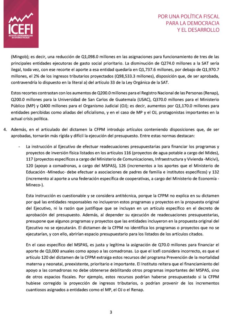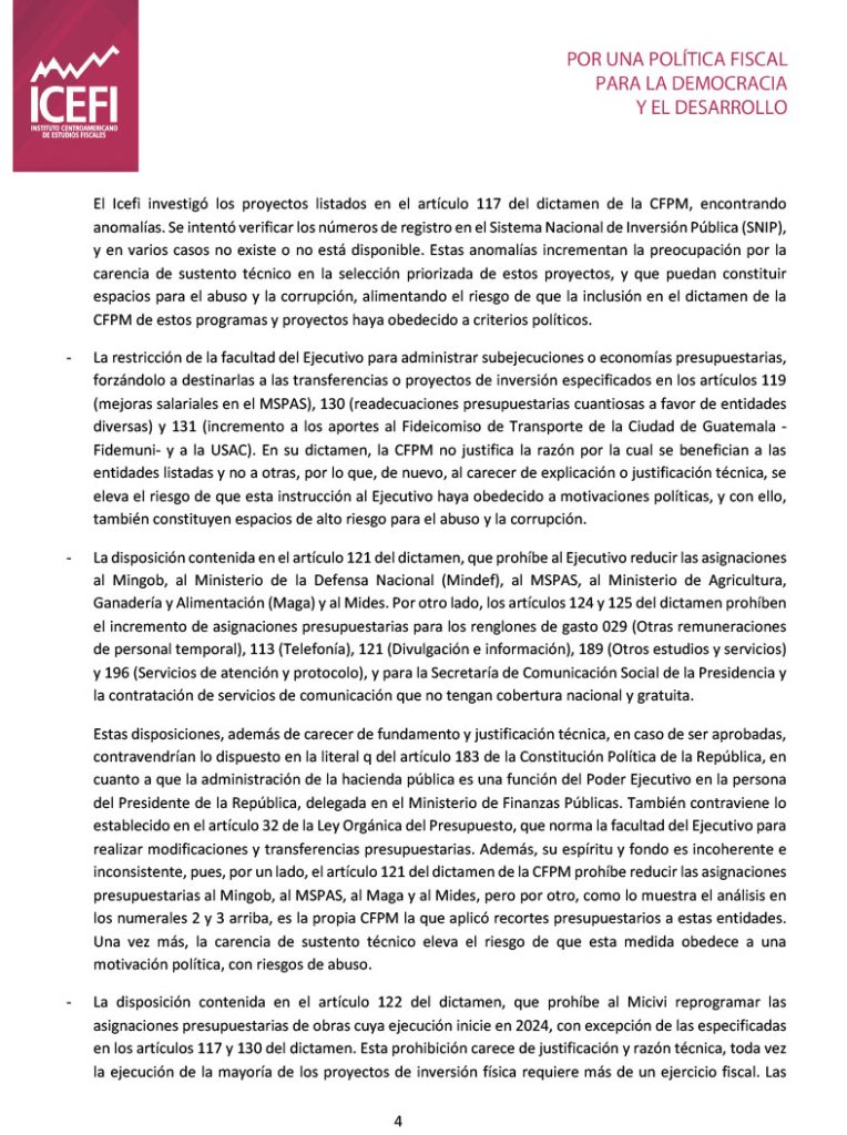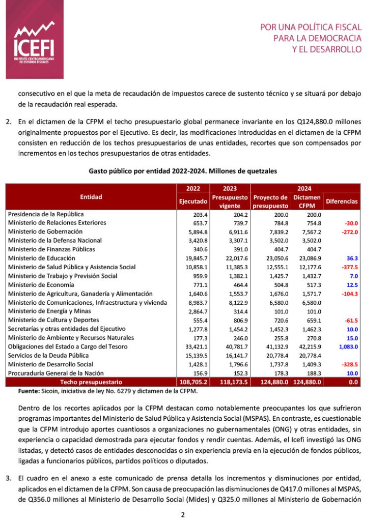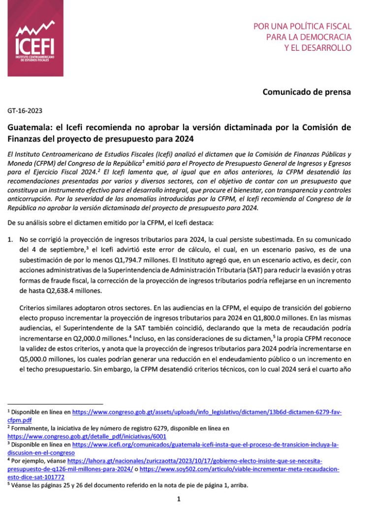 Todo lo anterior fue dado a conocer por medio de un comunicado en el que la ICEFI da su postura en la cual se detalló que se hizo un análisis al dictamen que la referida mesa de trabajo legislativo emitido al proyecto de Presupuesto General de Ingresos y Egresos para el Ejercicio Fiscal 2024.
