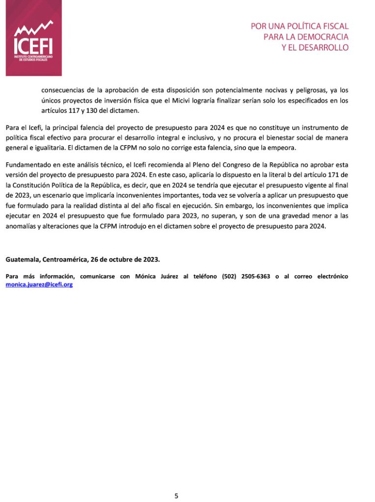 Por último, el Icefi dijo al Congreso que aprobar dicha versión del proyecto de Presupuestario 2024 representaría repercusiones de «gravedad» para el desarrollo de Guatemala.