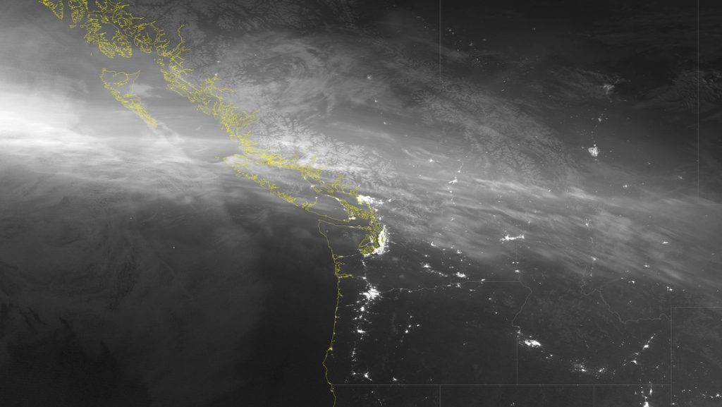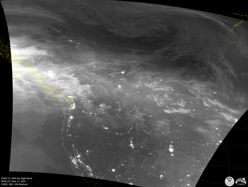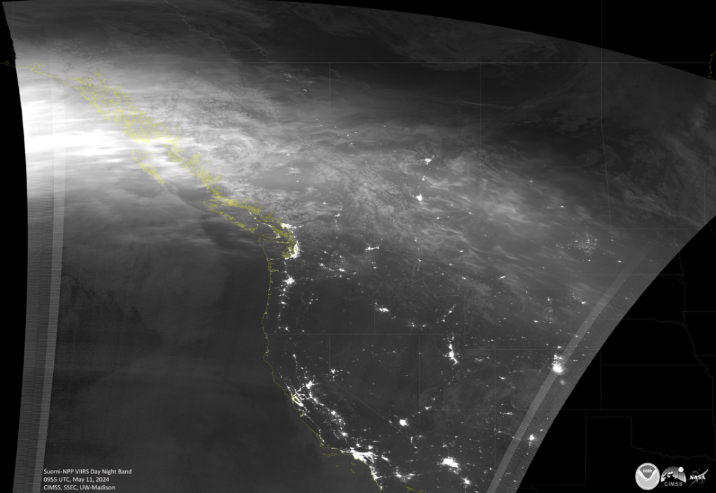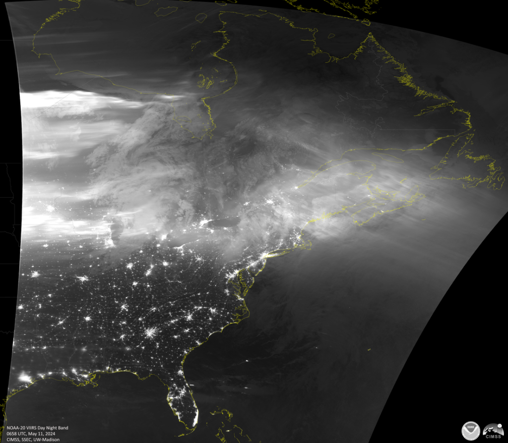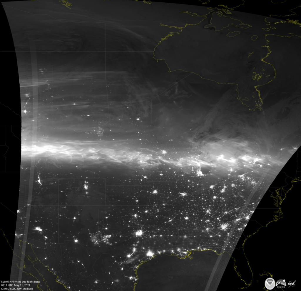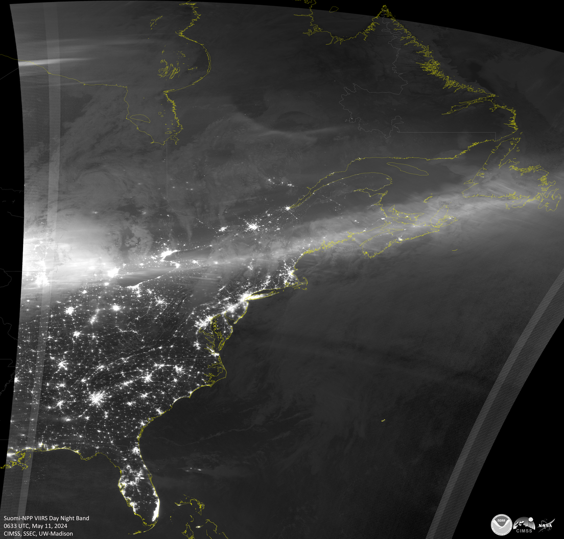 Las fotografías monocromáticas de banda diurna y nocturna fueron tomadas el sábado 11 de mayo sobre América del Norte por la flota del Sistema Conjunto de Satélites Polares (JPSS), concretamente por el conjunto de radiómetros de imágenes infrarrojas visibles (VIIRS) a bordo de estos satélites meteorológicos. El brillo de las auroras boreales se puede observar como una banda muy delineada en la mayoría de las imágenes.