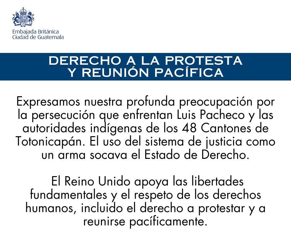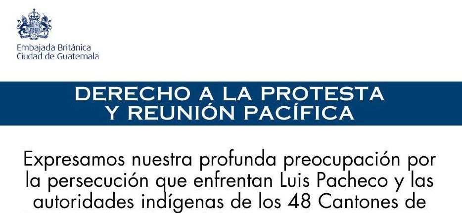 La Embajada Británica en Guatemala expresa su profunda preocupación por la persecución contra Luis Pacheco y las autoridades indígenas de los 48 Cantones de Totonicapán.