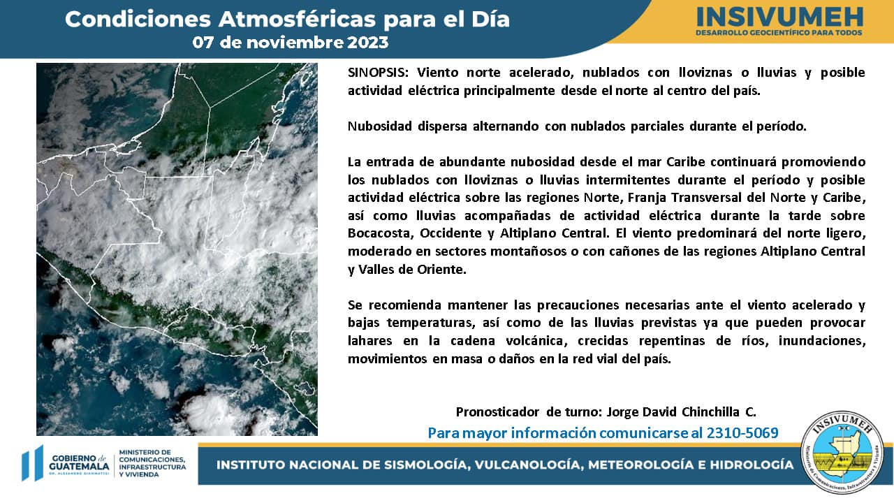 La entrada de abundante nubosidad desde el mar Caribe continuará promoviendo los nublados con lloviznas o lluvias intermitentes durante el período y posible actividad eléctrica sobre las regiones Norte, Franja Transversal del Norte y Caribe, así como lluvias acompañadas de actividad eléctrica durante la tarde sobre Bocacosta, Occidente y Altiplano Central”.