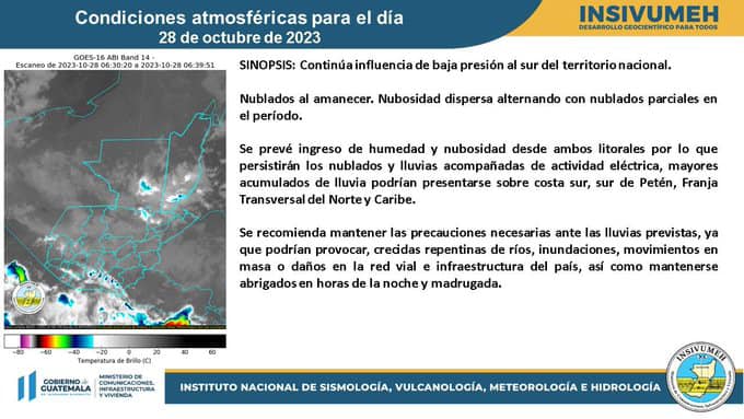 Debido al ingreso de humedad desde el Océano Pacífico, este sábado persisten los nublados y lluvias con actividad eléctrica en el país, de acuerdo con el pronóstico del Instituto Nacional de Sismología, Vulcanología, Meteorología e Hidrología (Insivumeh).