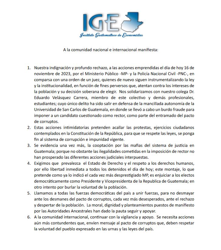 Rechazo profundo a las acciones emprendidas por el Ministerio Público y la Policía Nacional en comparsa con un juez, instrumentalizando la ley y las instituciones en función de fines perversos, expresa el Instituto Guatemalteco de Economistas, IGE, en un comunicado, debido a los hechos ocurridos con las capturas el día de ayer.
