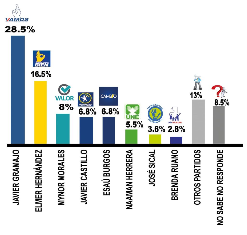 A tres días de las elecciones generales a realizarse el domingo 25 de junio, el alcalde Javier Gramajo, del partido VAMOS, se encamina a su reelección, según lo revela una nueva encuesta de la empresa Andes Consulting Latinoamérica, que lo coloca en primer lugar con 28.5%, seguido de Elmer Hernández, del partido BIEN, con 16.5%, saltando al tercer lugar Mynor Morales Zurita del partido VALOR, con 8%.