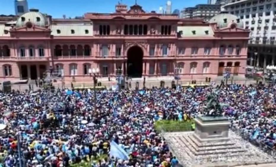 A las afueras del Congreso, miles de personas se congregaron para celebrar su investidura. Vestidos con camisetas de la selección de fútbol y llevando banderas argentinas, esperaron su discurso en la plaza.