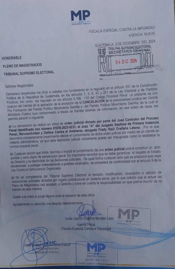 Por medio de un oficio enviado al pleno de magistrados del Tribunal Supremo Electoral, TSE, la agente fiscal de la Fiscalía Especial contra la Impunidad del Ministerio Público (MP), Leonor Eugenia Morales Lazo, advirtió que, si ellos no confirman la cuestionada cancelación del partido Movimiento Semilla, podrían ser sujetos de una investigación penal.