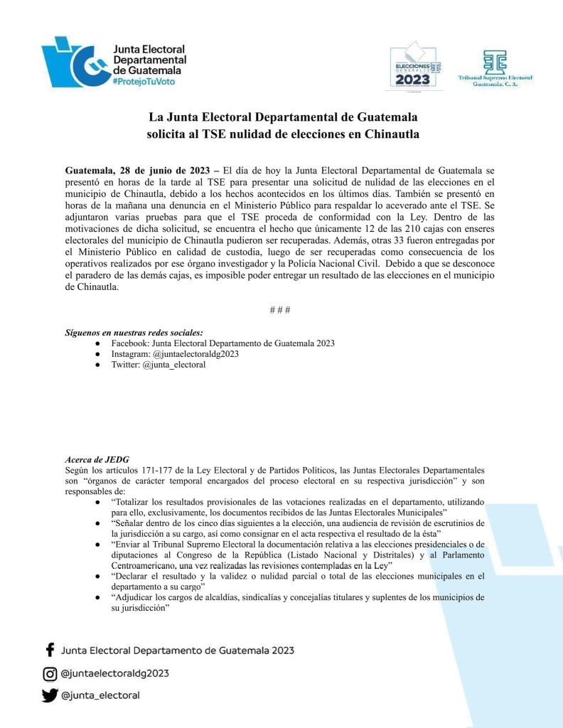 La tarde de este miércoles la Junta Electoral Departamental de Guatemala se presentó al Tribunal Supremo Electoral TSE para presentar una solicitud de nulidad de las elecciones en el municipio de Chinautla, debido a los hechos acontecidos en los últimos días.