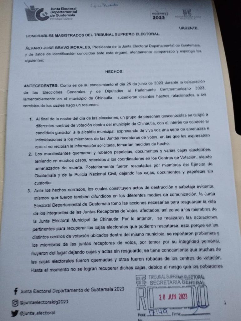 “Debido a que se desconoce el paradero de las demás cajas, es imposible poder entregar un resultado de las elecciones en el municipio de Chinautla” expresa la junta electoral departamental de Guatemala