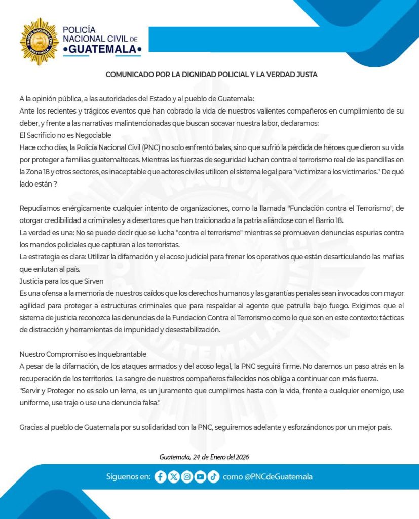 A pesar de la difamación, de los ataques armados y del acoso legal, la PNC seguirá firme. No daremos un paso atrás en la recuperación de los territorios. La sangre de nuestros compañeros fallecidos nos obliga a continuar con más fuerza” agrega el l comunicado de la institución policial.
