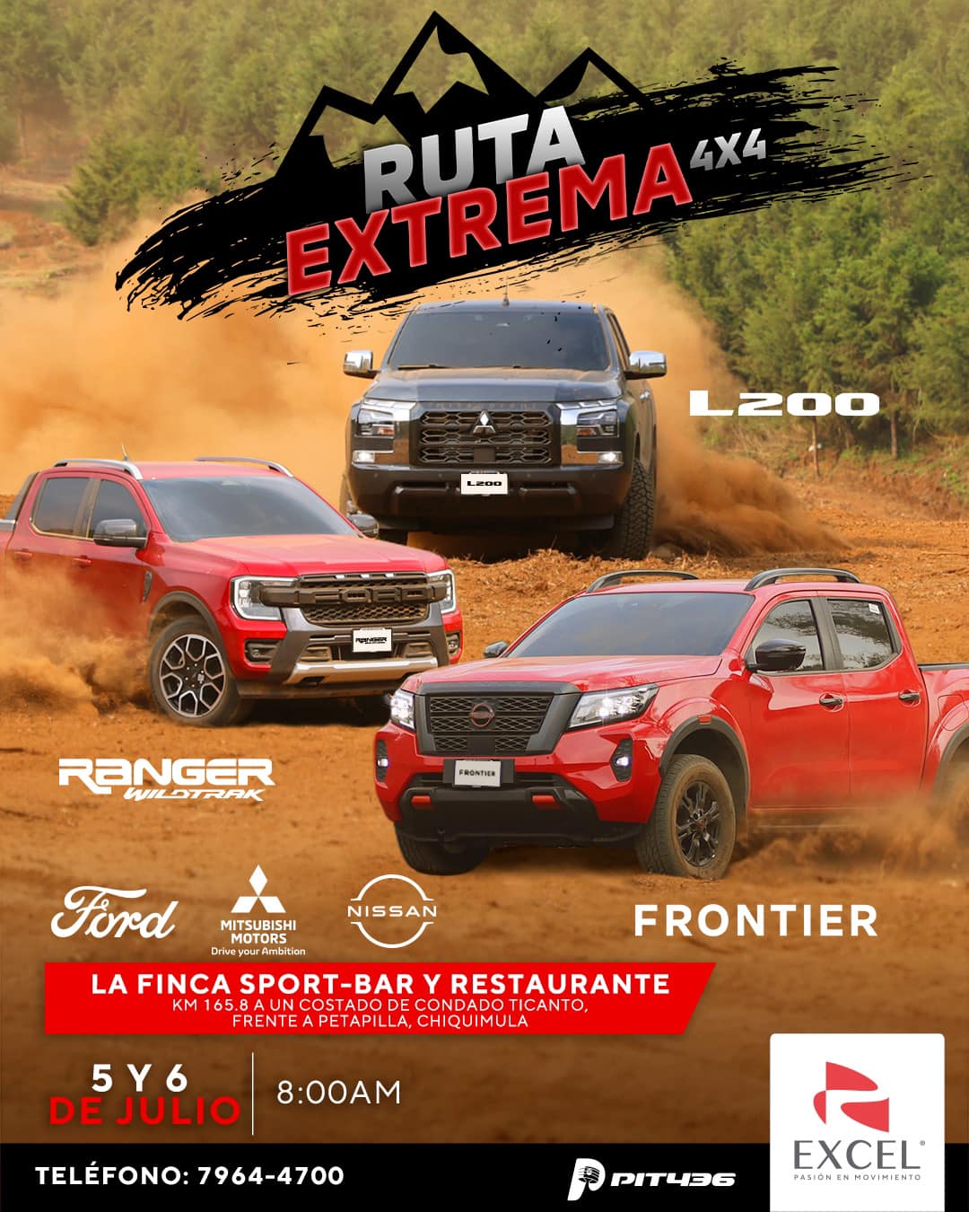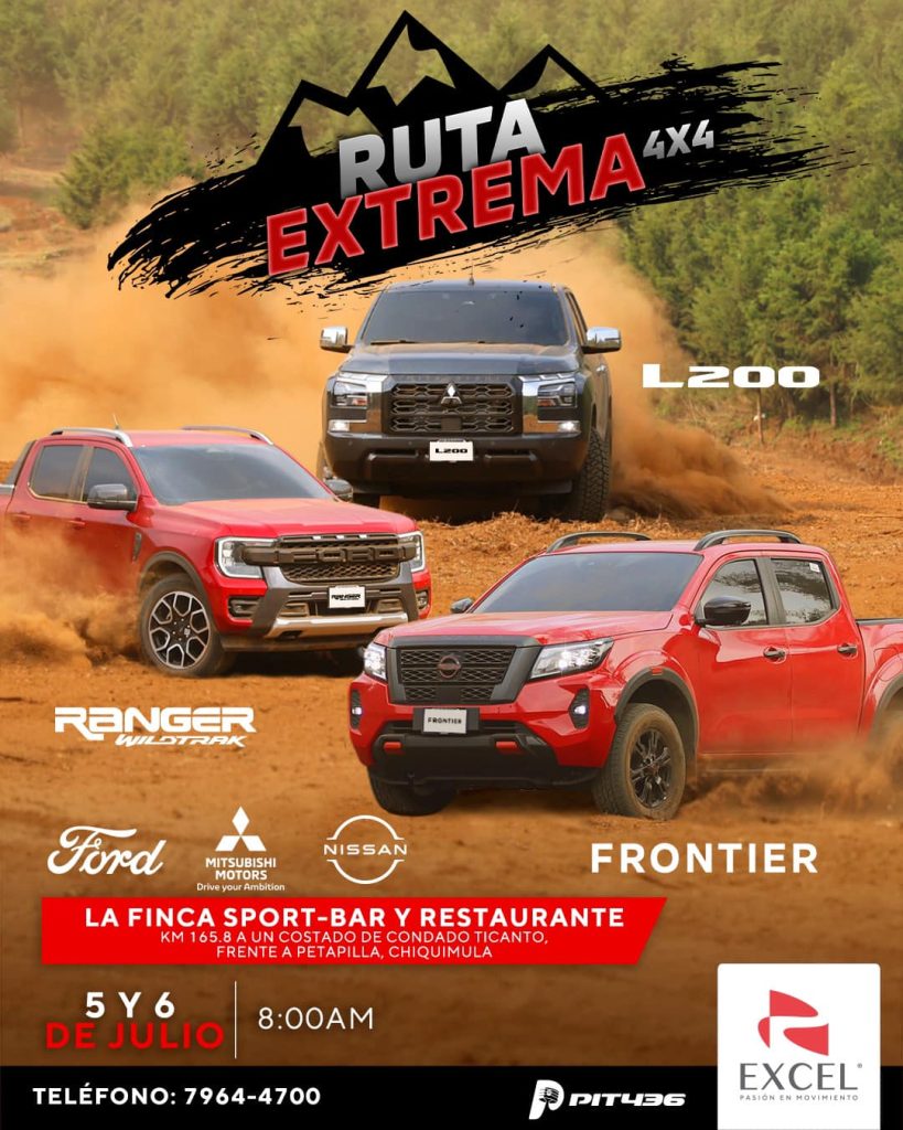 La Ruta Extrema 4×4 reunirá a grandes y chicos fanáticos de la aventura para conocer de primera mano las principales características de los icónicos modelos Nissan Frontier, el nuevo Mitsubishi L200 y Ford Ranger, a partir del próximo 05 de julio de 2024 La Finca Sport Bar Restaurante, en Chiquimula, Chiquimula, donde se dará el banderazo inaugural para esta gira.