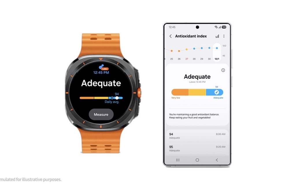 ●Utiliza el Galaxy Watch para medir los carotenoides, que son antioxidantes presentes en las verduras y frutas de color verde y naranja, almacenados en tu piel.