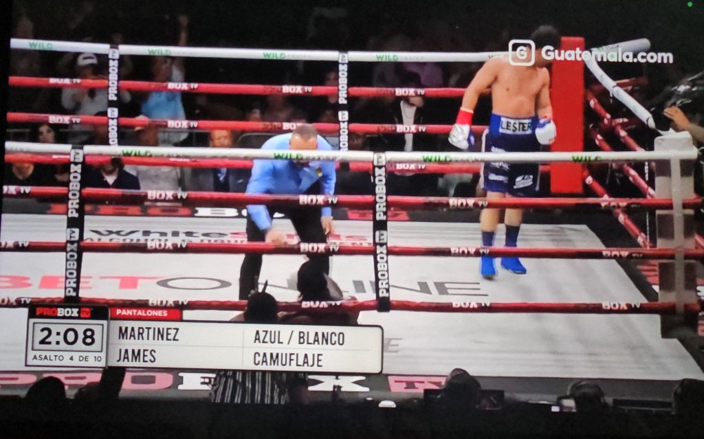 Desde el inicio de la pelea, Martínez supo contener a su rival y dejar huella en cada golpe que acertó. En los últimos segundos del tercer asalto, una serie de golpes dejó sin oportunidad a James, que fue salvado por la campana.