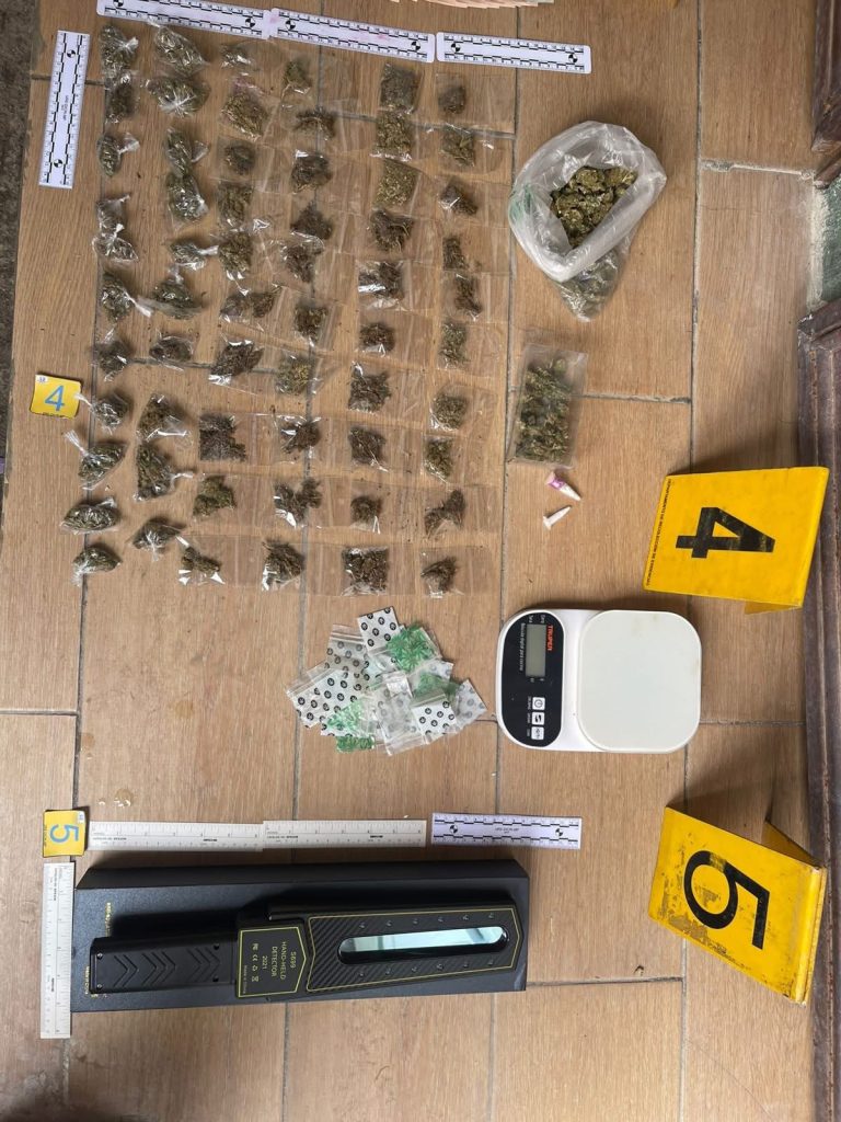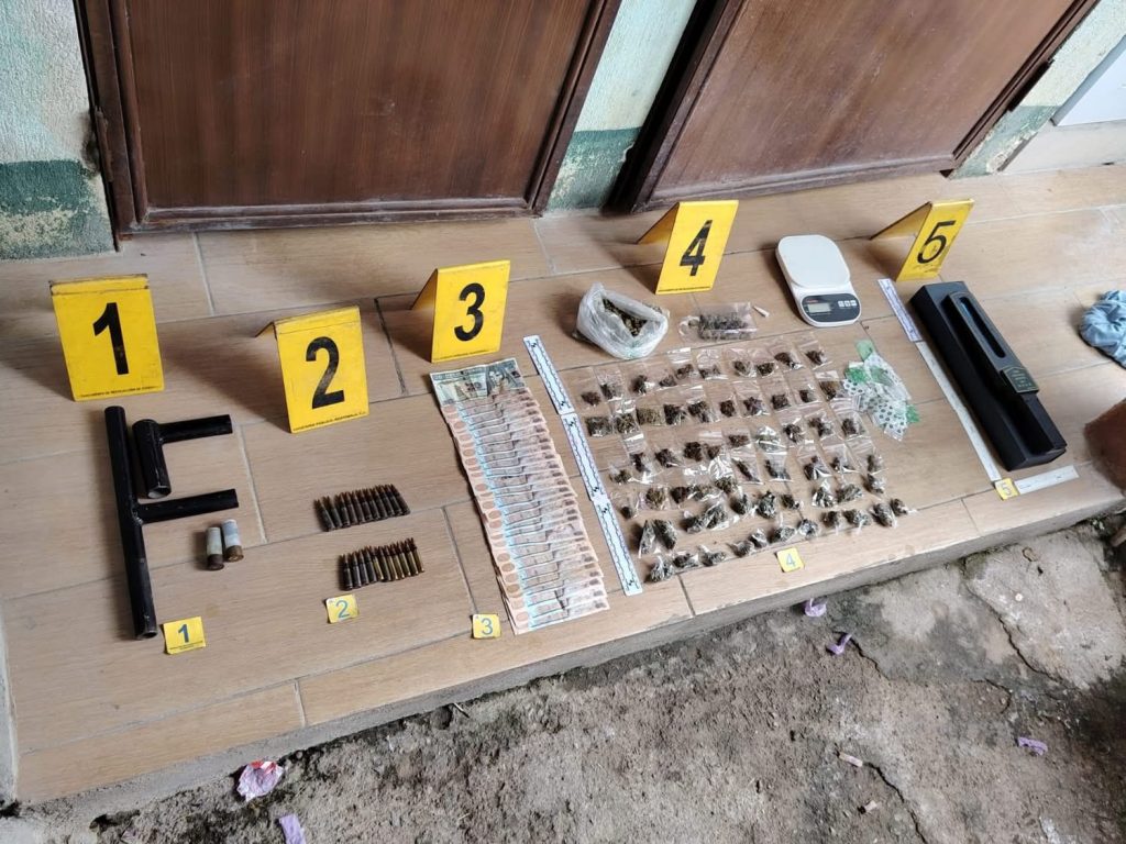 En el inmueble fue localizado una escopeta hechiza, varias municiones de diferentes calibres, 61 bolsas con marihuana, dos “colmillos” con cocaína, Q.2 mil 600, una balanza electrónica y dos teléfonos celulares,