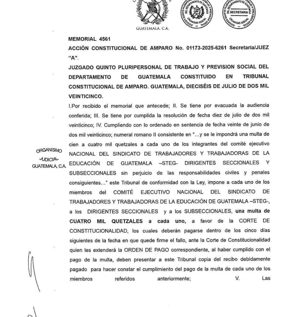 La Procuraduría General de la Nación (PGN) fue notificada este jueves 17 de julio sobre la resolución del Juzgado Quinto Pluripersonal de Trabajo y Previsión Social, que impone una multa de Q4,000.00 a cada integrante del Comité Ejecutivo Nacional del Sindicato de Trabajadores de la Educación de Guatemala (STEG), y subseccionales por incumplimiento de una orden judicial previa que instruía cesar las limitaciones al acceso a la educación pública.