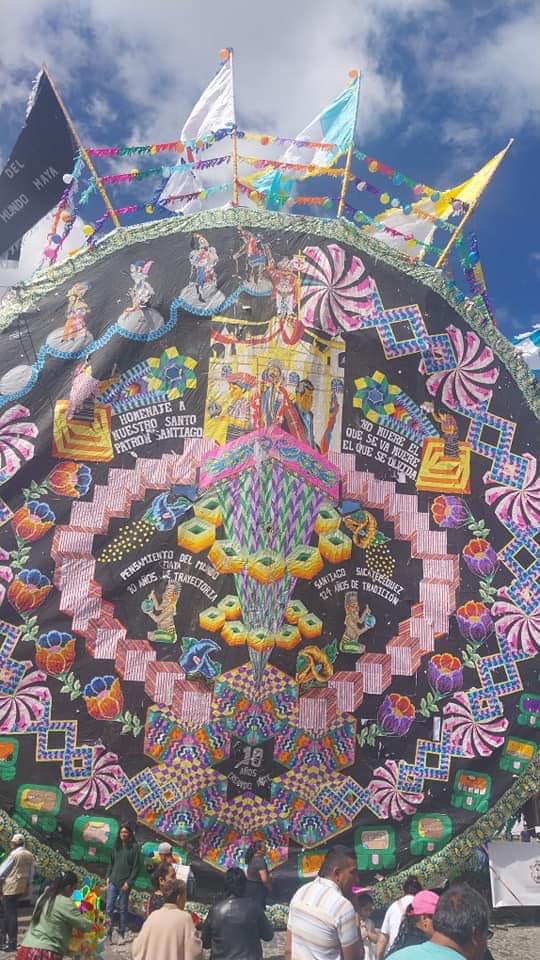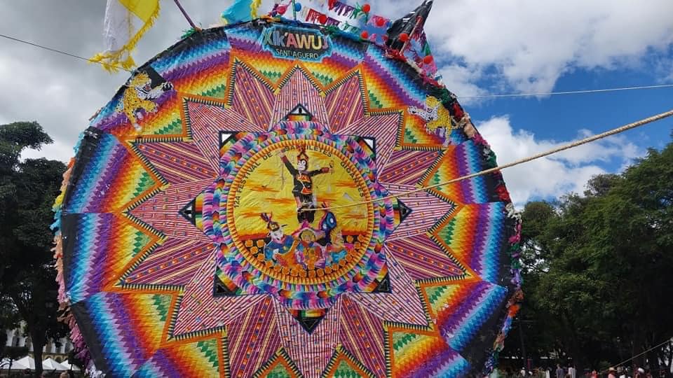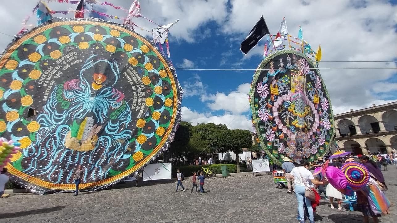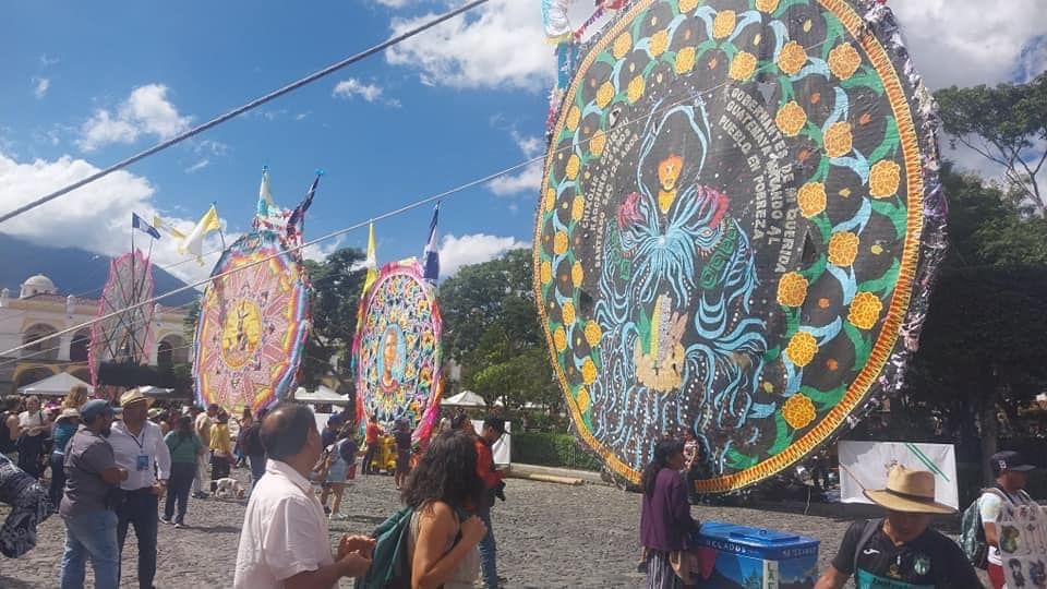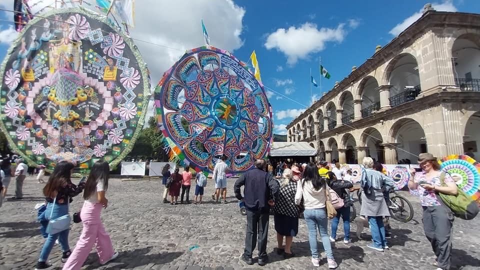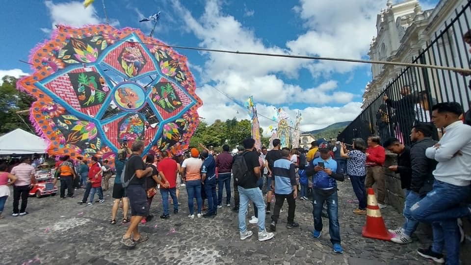 De colores se viste este domingo el Ayuntamiento de La Antigua Guatemala con la exposición de barriletes gigantes procedente de Santiago Sacatepéquez que son admirados por vecinos y turistas que visitan la ciudad colonial.