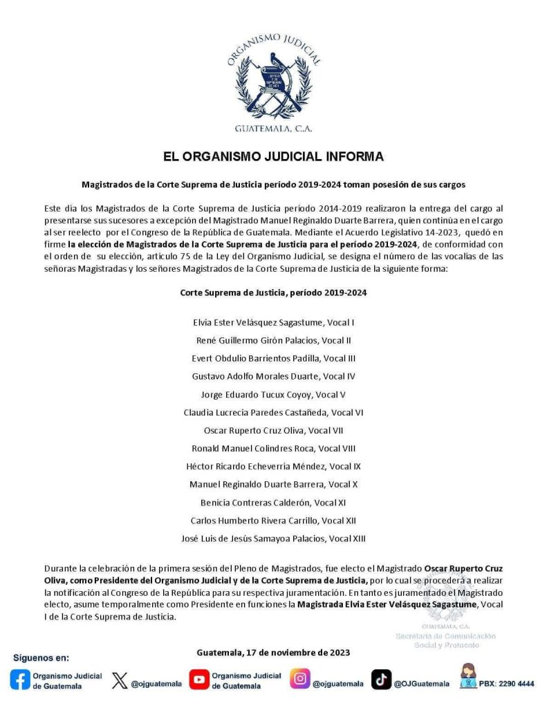 Durante la celebración de la primera sesión del Pleno de Magistrados, fue electo el Magistrado Oscar Ruperto Cruz Oliva, como Presidente del Organismo Judicial y de la Corte Suprema de Justicia, por lo cual se procederá a realizar la notificación al Congreso de la República para su respectiva juramentación.