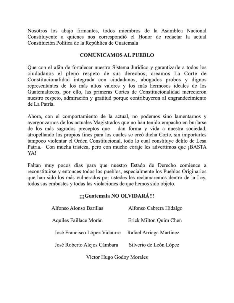 En su comunicado expresan que “con el afán de fortalecer nuestro Sistema Jurídico y garantizarle a todos los ciudadanos el pleno respeto de sus derechos, creamos La Corte de Constitucionalidad integrada con ciudadanos, abogados probos y dignos representantes de los más altos valores y los más hermosos ideales de los Guatemaltecos, por ello, las primeras Cortes de Constitucionalidad merecieron nuestro respeto, admiración y gratitud porque contribuyeron al engrandecimiento de La Patria.”