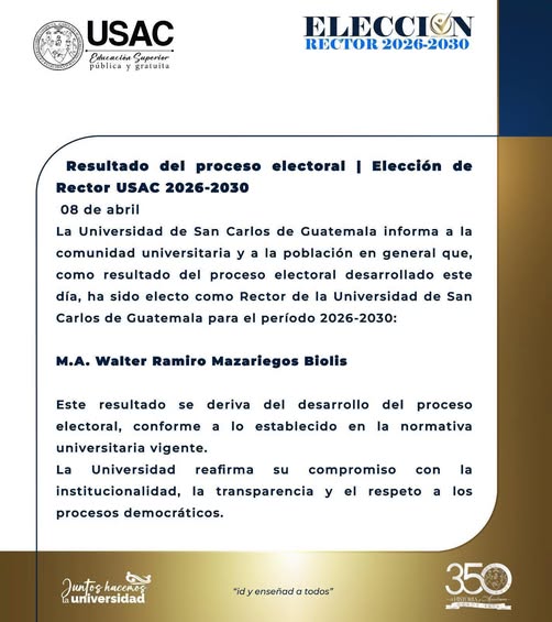 Walter Mazariegos fue reelecto como rector de la Usac para el período 2026-2030, según lo informó la casa de estudios en un comunicado de prensa