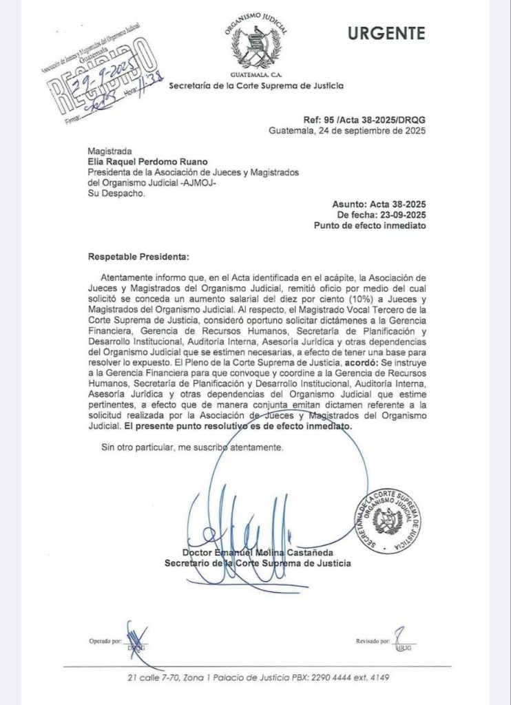 Mientras que jueces favorecen a criminales de alto impacto buscando su comodidad después de graves delitos a la ciudadanía guatemalteca, los magistrados de la Corte Suprema de Justicia buscan aumentarse su salario en un 10% en una solicitud realizada por la Asociación de Jueces y Magistrados del Organismo Judicial, el cual ya fue recibido y se le dio trámite.